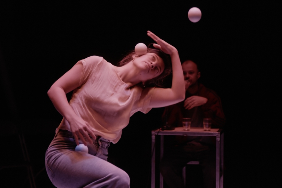 « Tout ce qui me passe par la tête sort par la bouche de Pierre. Alors j’espère que je ne vais pas penser n’importe quoi ce soir ». Bienvenue dans la tête de Neta Oren ! Ultra-concentrée sur ses mouvements, la jongleuse laisse parfois ses pensées s’évader. Le rappeur Pierre Laloge se fait alors le porte-voix de ses digressions intimes. Au rythme des lancers, le flow des mots peut évoquer le doute devant des yeux qui s’ennuient, la main qui tremble après un raté, l’euphorie d’une rattrape risquée, le kungfu, les apnéistes ou les petites choses précieuses de la vie. Un dialogue aussi intense qu’inventif entre cirque virtuose et art de la punchline.
