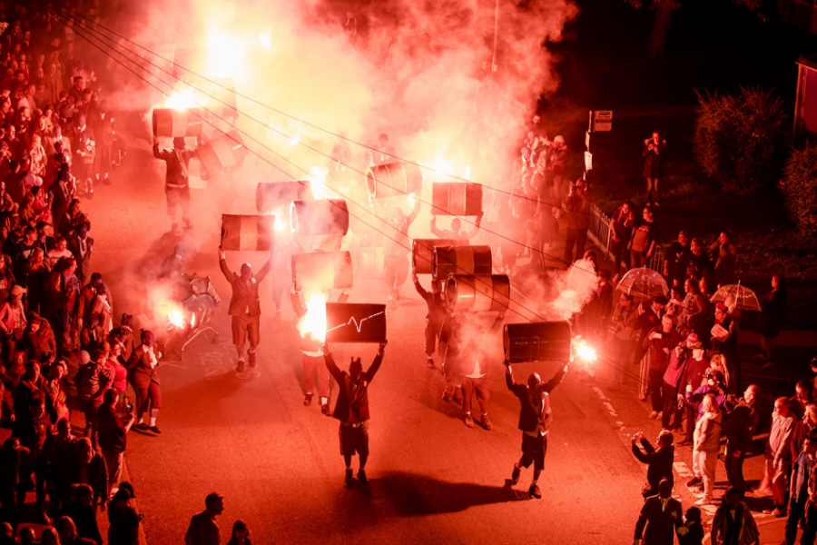 Déambulation avec 15 comédiens, 3 musiciens et 102 bidons par Générik Vapeur.