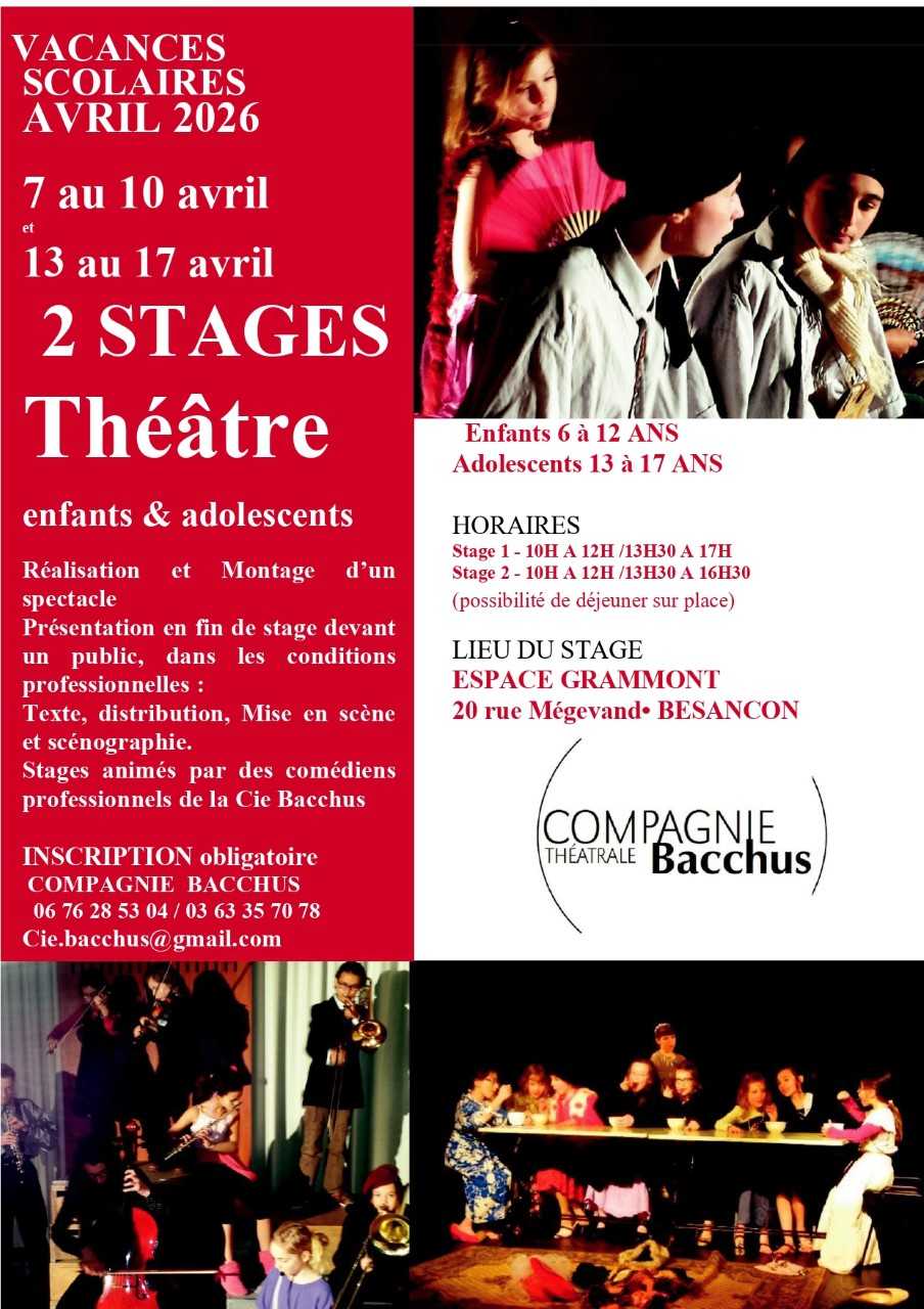 La compagnie Bacchus propose 2 stages de théâtre pour enfants et ( 6/12 ans et 13/18 ans) pendant les vacances de printemps.