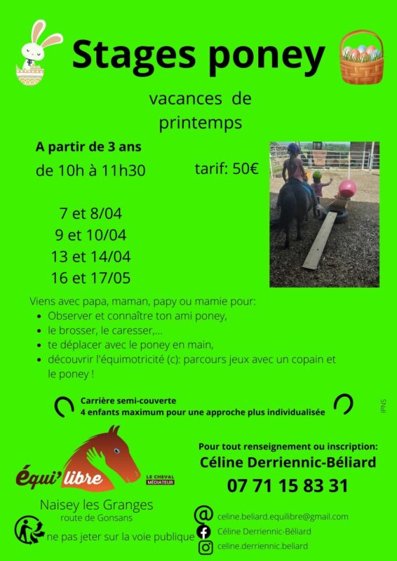 Stages poney et découverte de l’équimotricité(c) proposés pour les vacances de printemps à Naisey les Granges par Equi’libre le cheval médiateur.