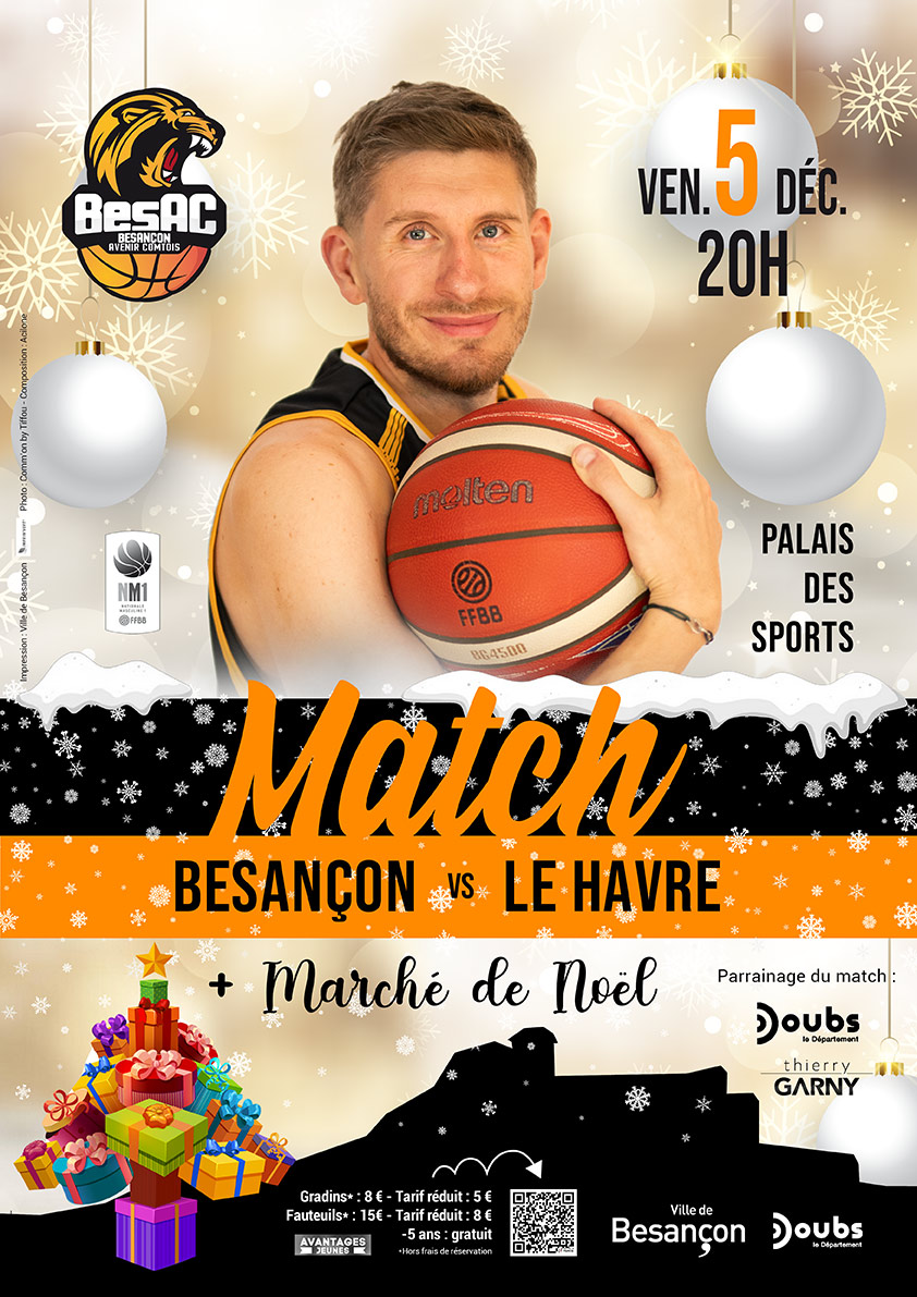 Match de basketball opposant le BesAC basket au Havre, actuel leader du championnat de Nationale 1. Avant et pendant la rencontre, le public pourra profiter d’un Marché de Noël...