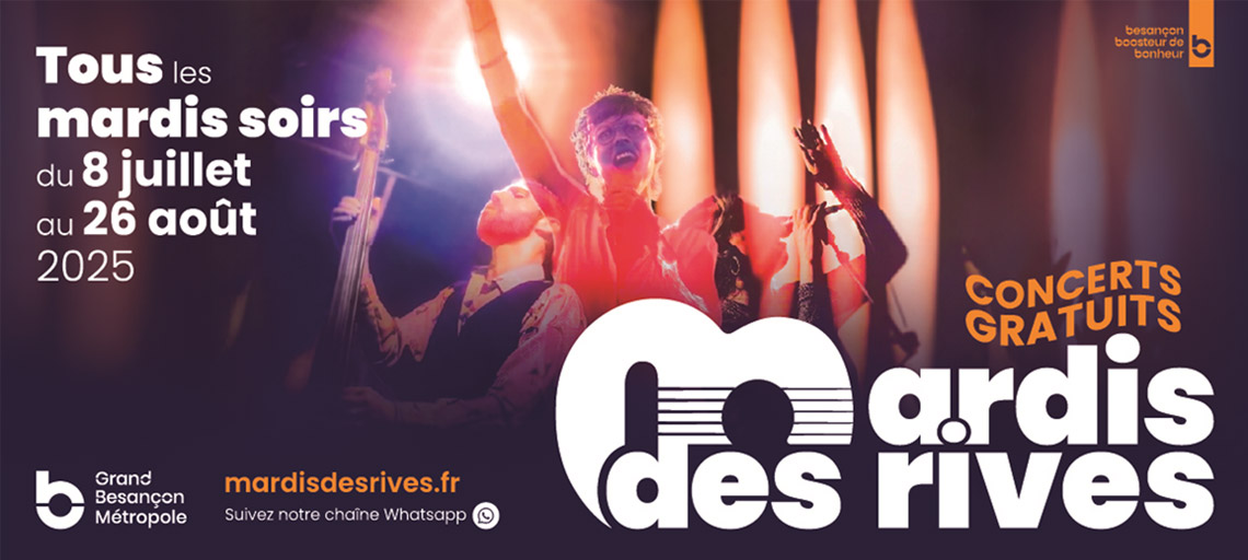 15 juin 2022Les Mardis des rives reviennent cet été pour une 9e édition particulièrement réjouissante. Les festivités sont prévues tous les mardis du 5 juillet au 30 août. Ce festival musical est proposé et mis en œuvre par le Grand Besançon en partenariat avec les communes d’accueil situées l...