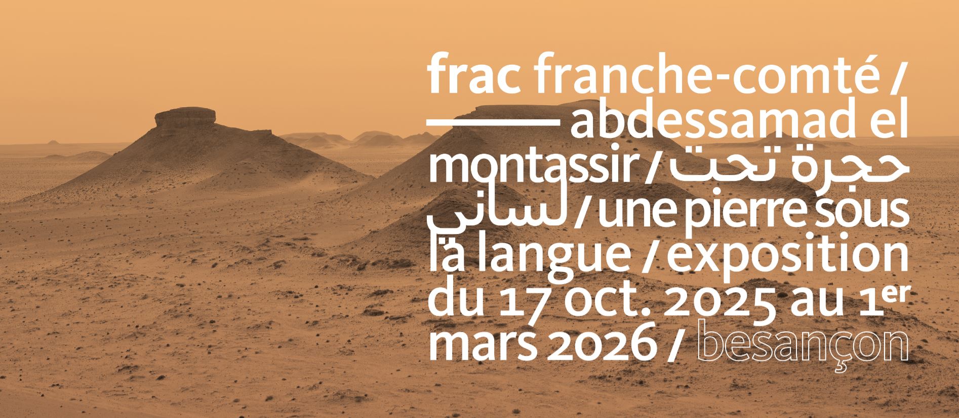 20 octobre 2025Depuis jeudi, le Frac Franche-Comté accueille l’exposition Une pierre sous la langue signée Abdessamad El Montassir, visible jusqu’au 1er mars. Né dans le Sahara du Sud marocain et installé aujourd’hui à Lons-le-Saunier, l’artiste explore depuis dix ans la mémoire et les paysages d...